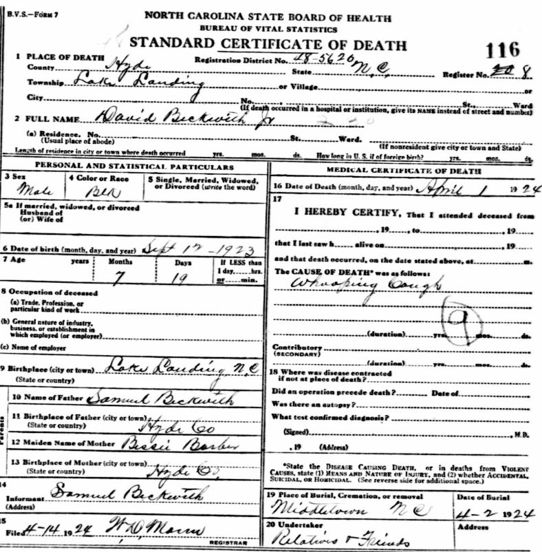 | Beckwith, Jr., David | Sept. 12, 1923 | Apr. 1, 1924 | [see death certificate] |