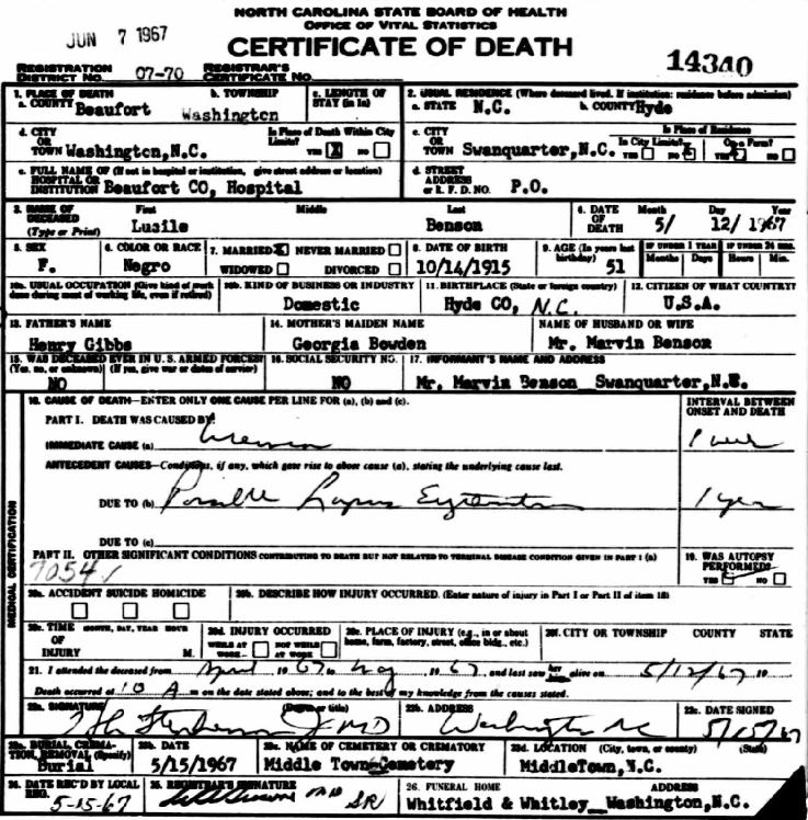 | Benson, Lucille | Oct. 14, 1915 | May 12, 1967 | [see death certificate] |