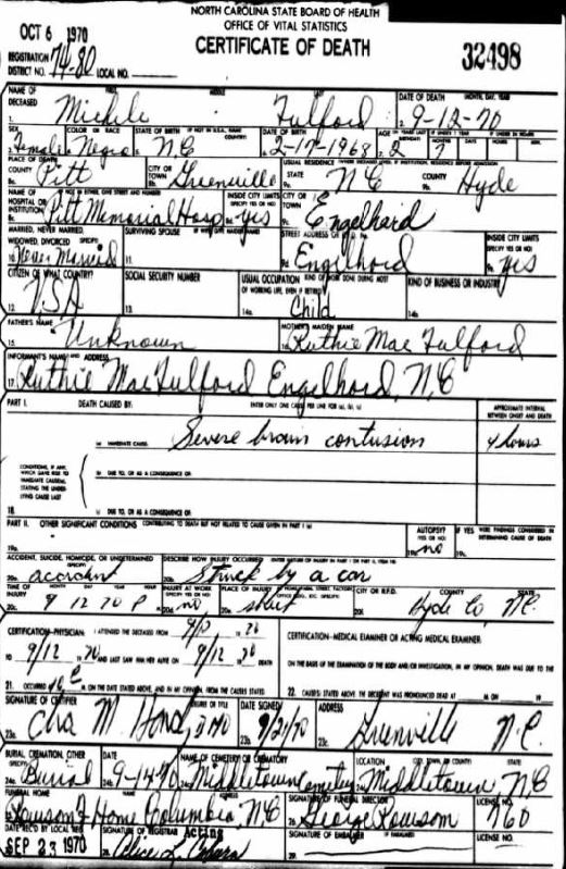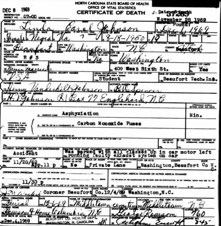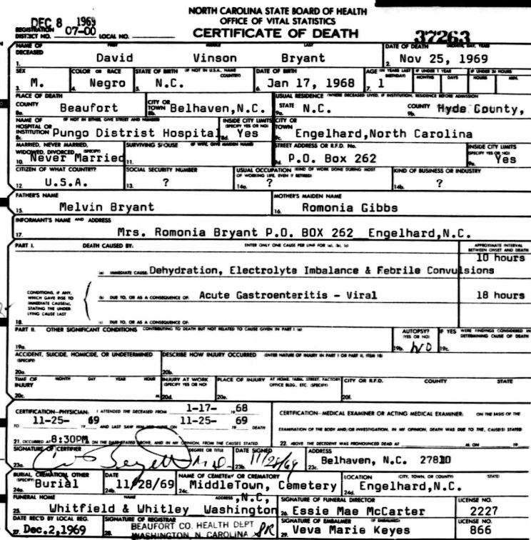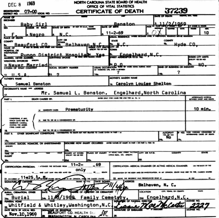 | Benston, baby girl | Nov. 2, 1969 | Nov. 2, 1969 | [see death certificate] |