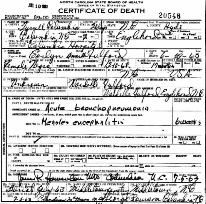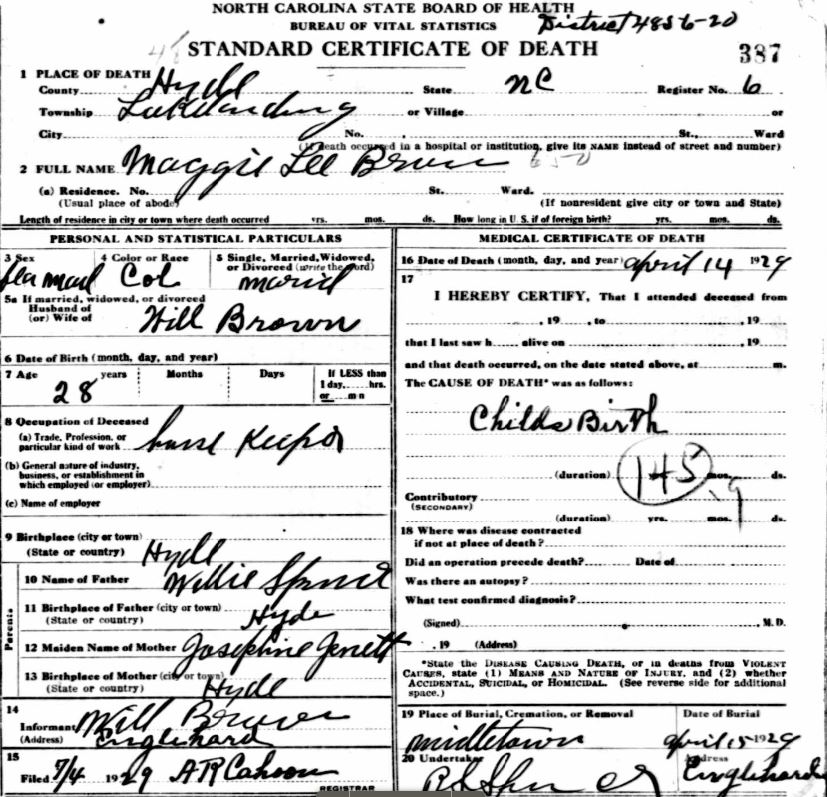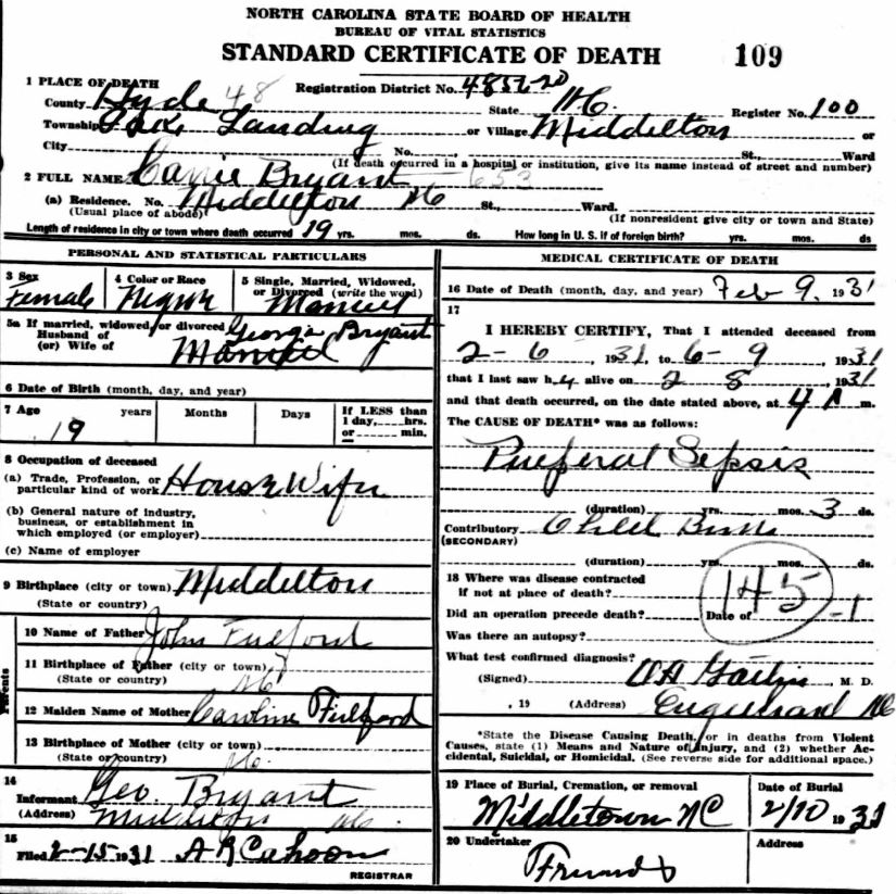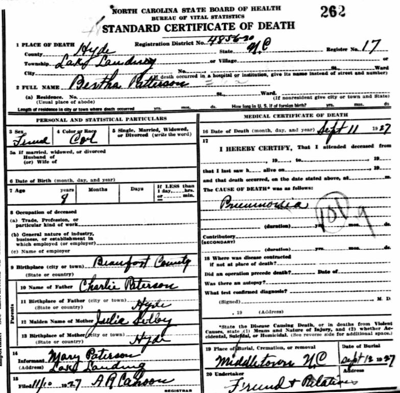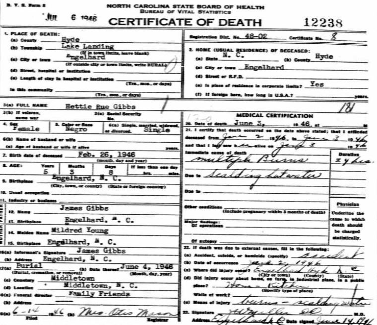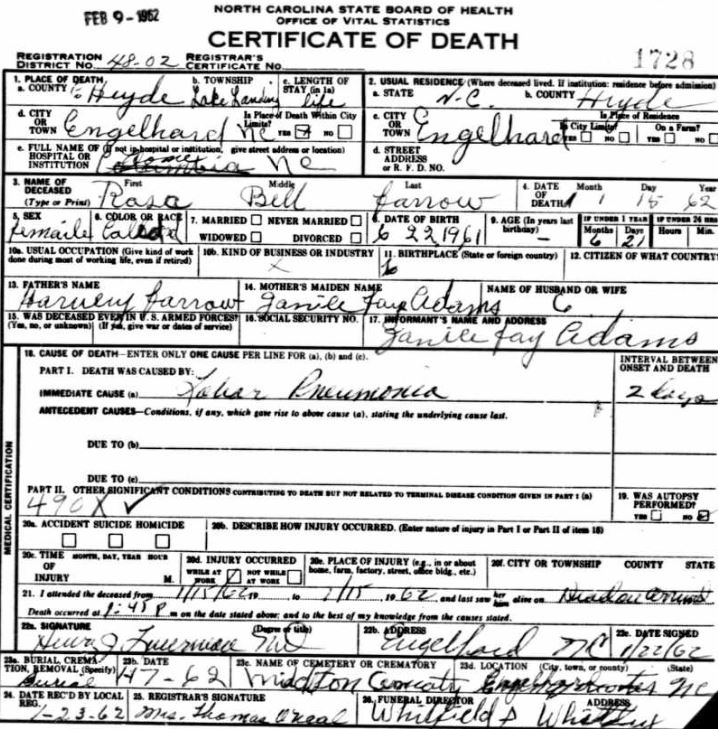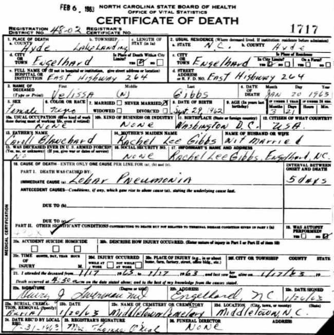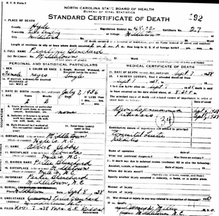 | Blanchard, Pearline | July 7, 1936 | Sept. 7, 1938 | [see death certificate] |
