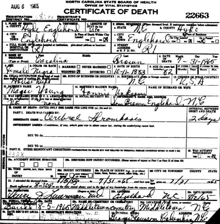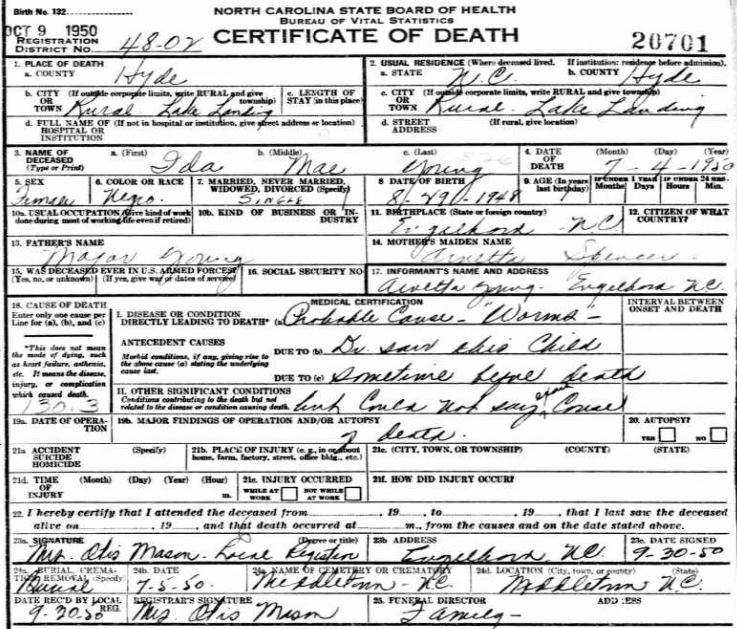 | Young, Ida Mae | Aug. 29, 1948 | July 4, 1950 | [see death certificate] |