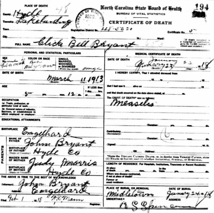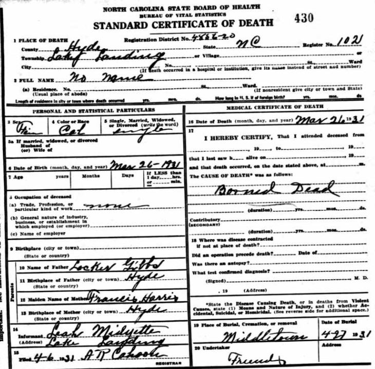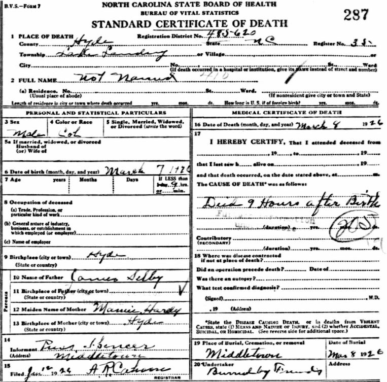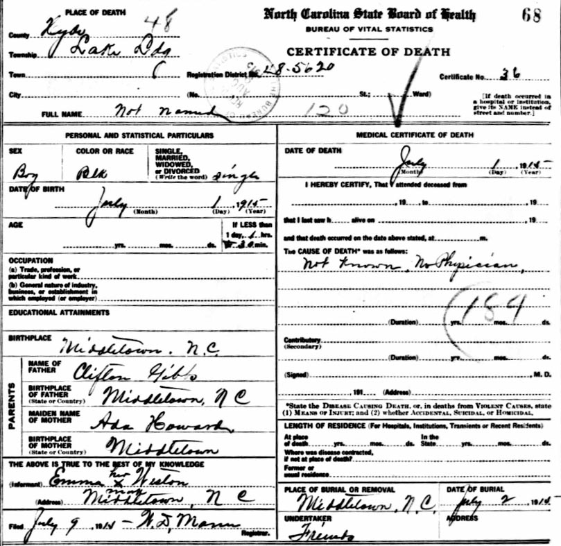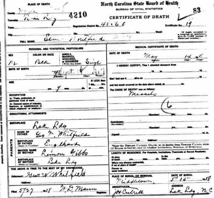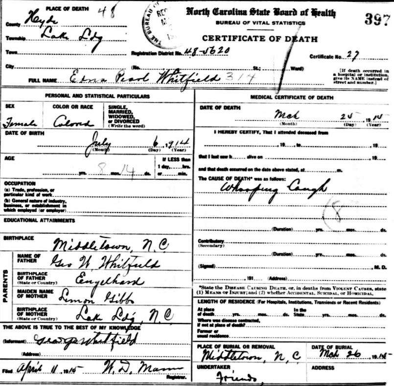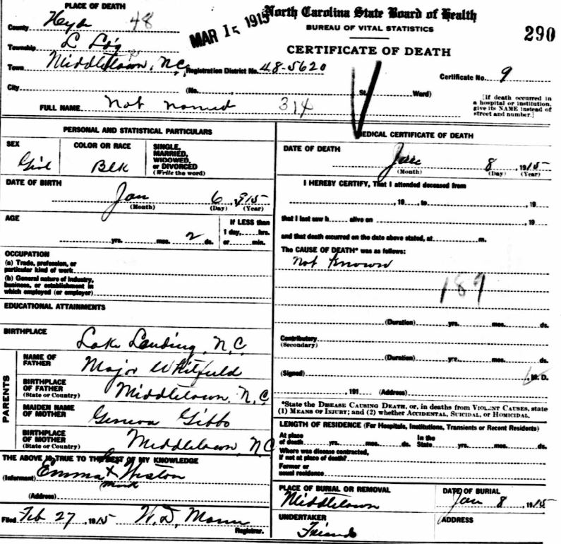 | Whitfield, infant girl | Jan. 6, 1915 | Jan. 8, 1915 | [see death certificate] |