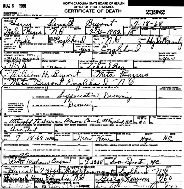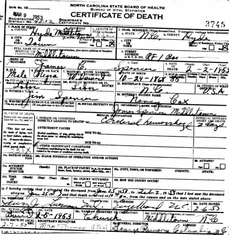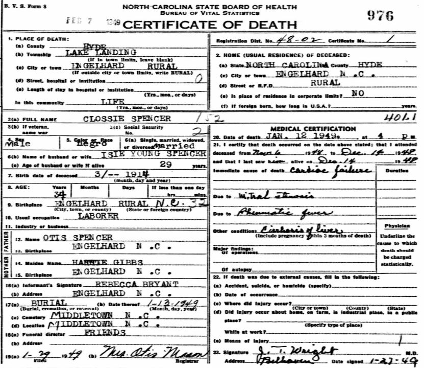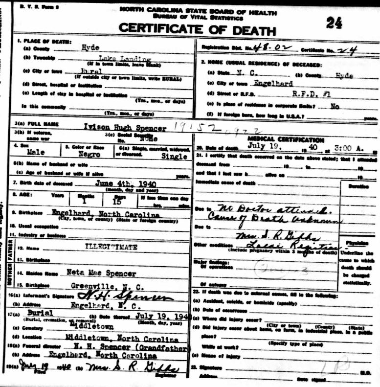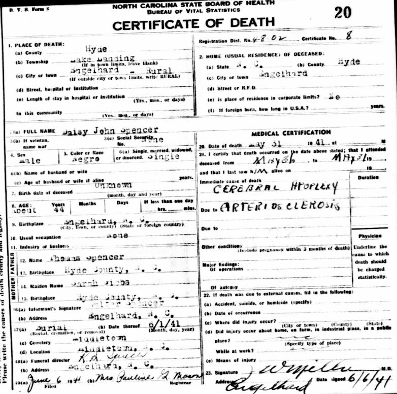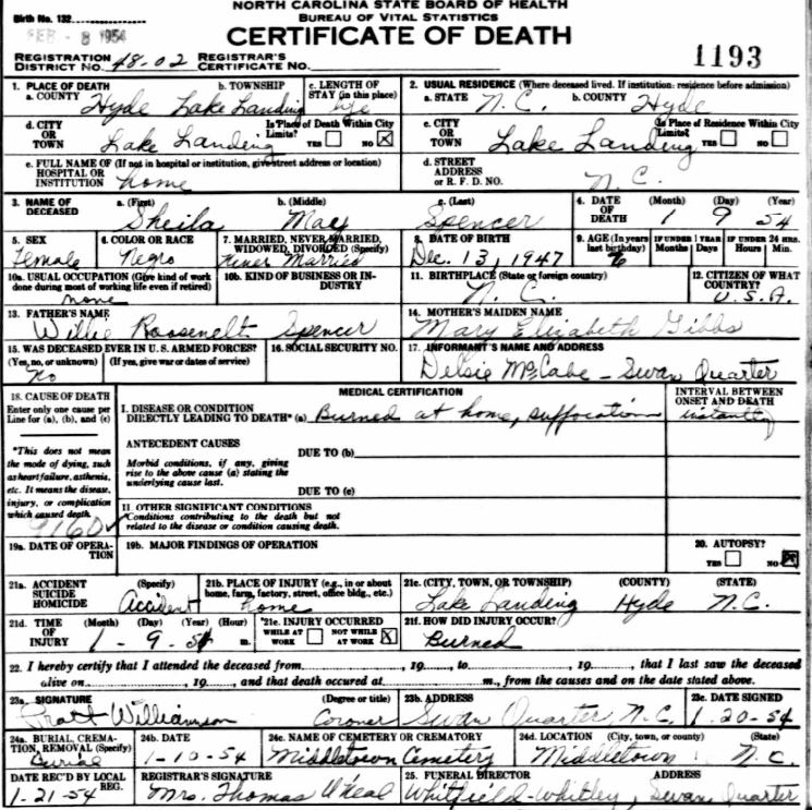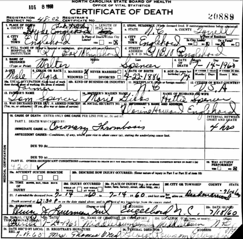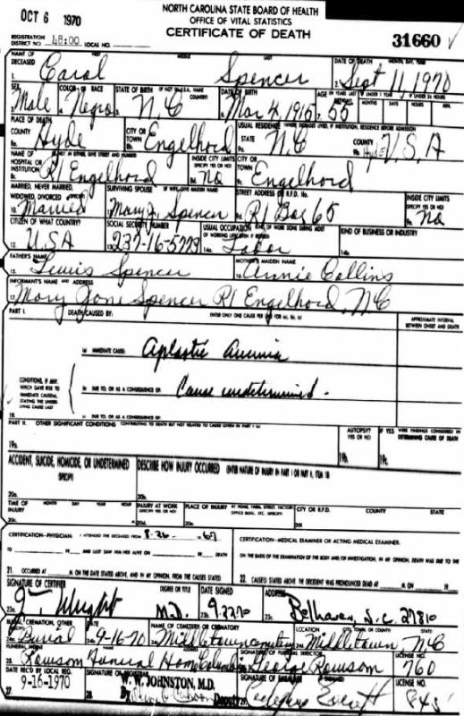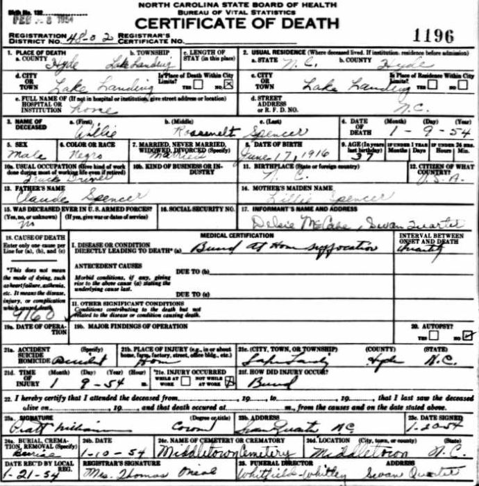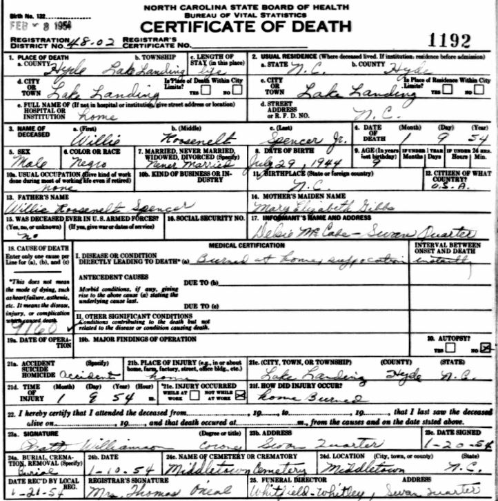 | Spencer, Jr., Willie Roosevelt | July 29, 1944 | Jan. 9, 1954 | [see death certificate] |