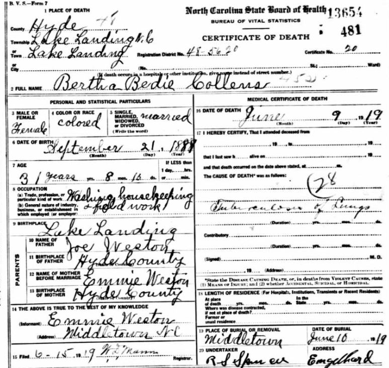 | Barber, Bertha Lee | June 19, 1897 | June 23, 1917 | [seedeath certificate] |