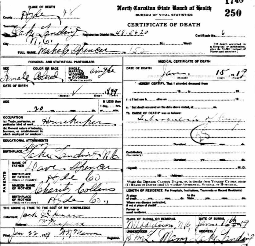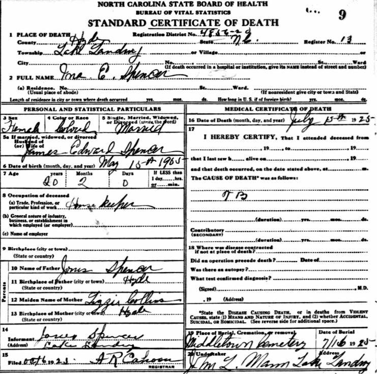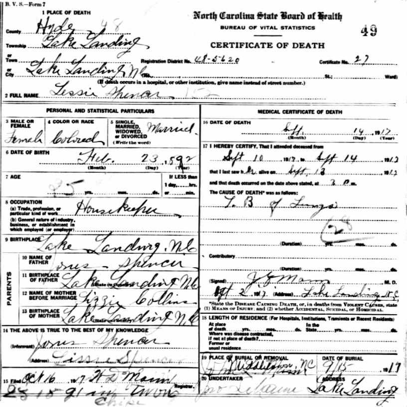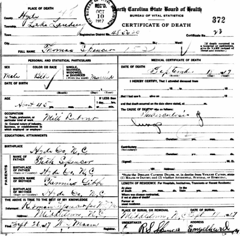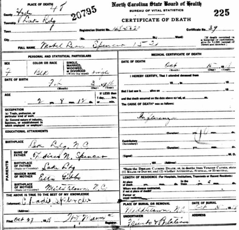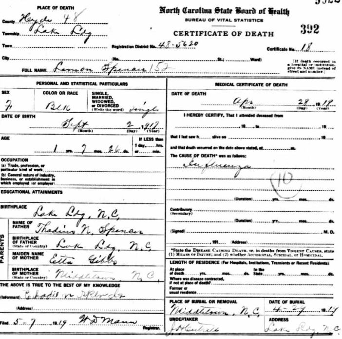 | Spencer, Lemon | Sept. 2, 1917 | Apr. 28, 1919 | [see death certificate] |