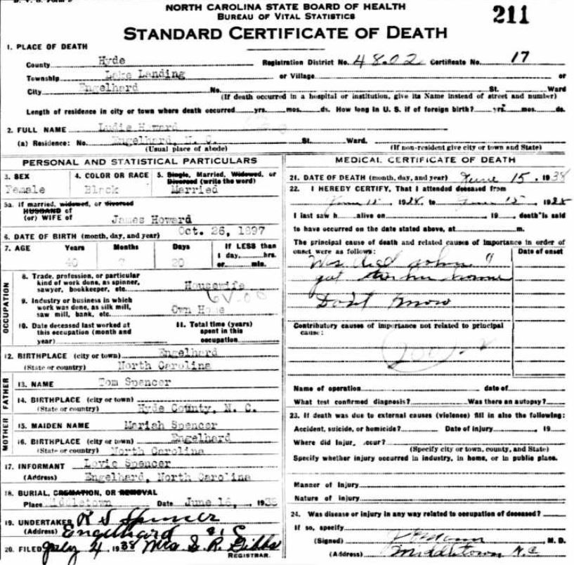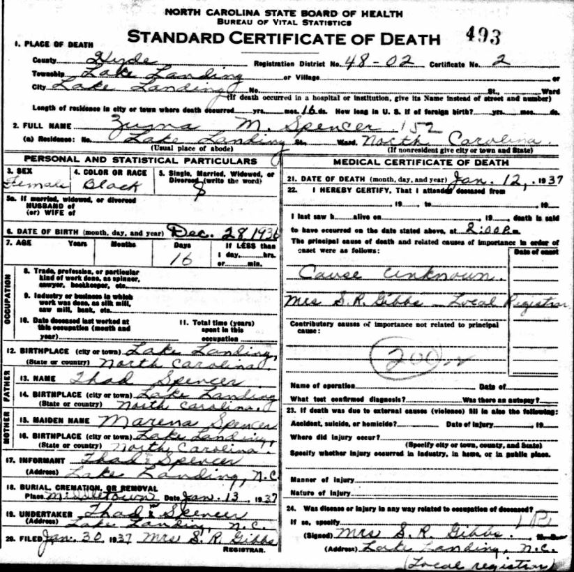 | Spencer, Zuma M. | Dec. 28, 1936 | Jan. 12, 1937 | [see death certificate] |