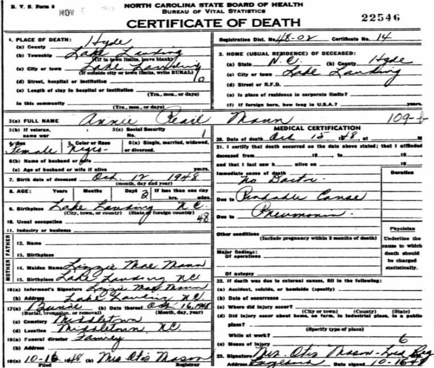 | Anderson, Annie | Sept. 1, 1910 | March 6, 1945 | [see death certificate] |