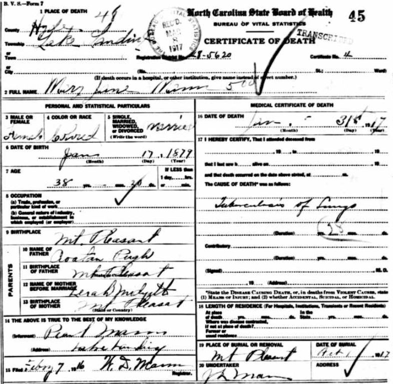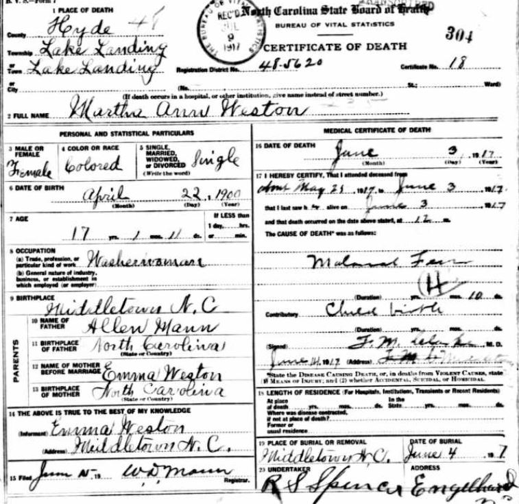 | Weston, Martha Ann | Apr. 22, 1900 | June 3, 1917 | [see death certificate] |