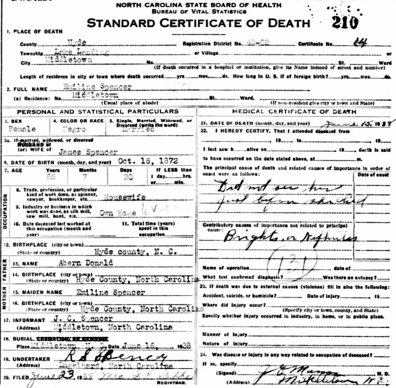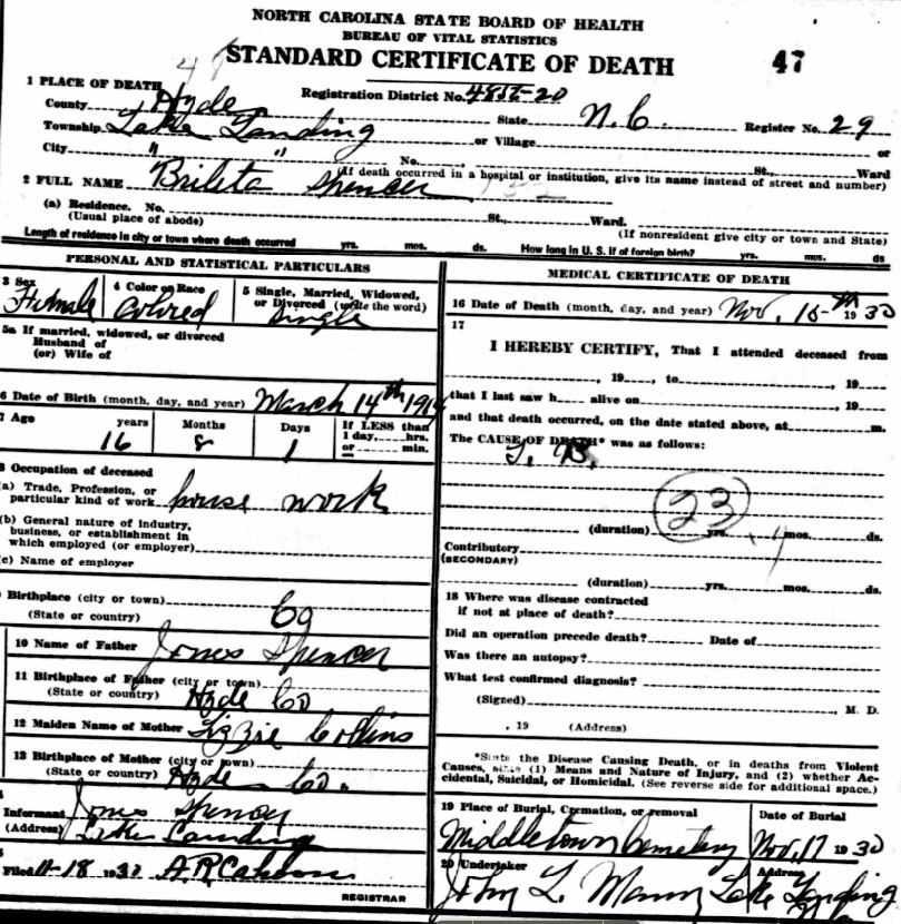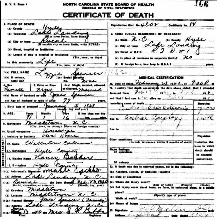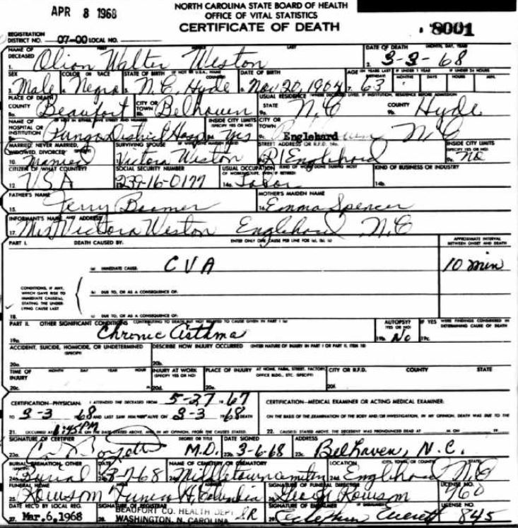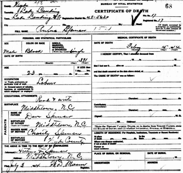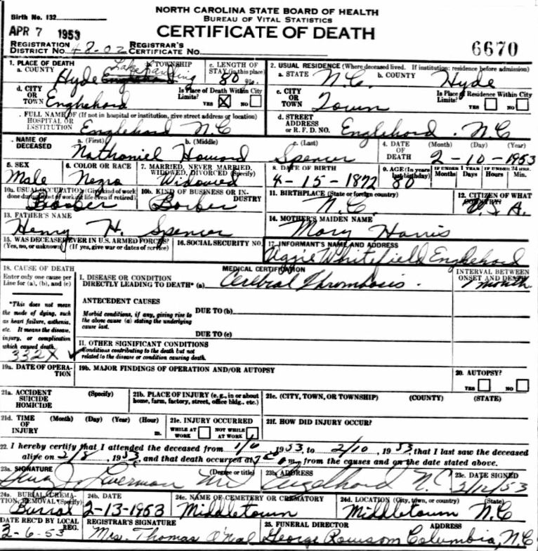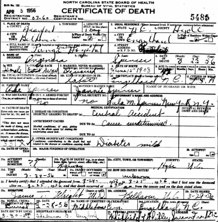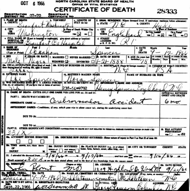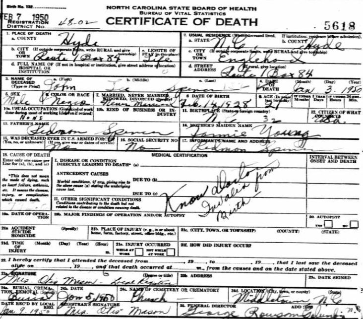 | Spencer, Willie Roosevelt | June 17, 1916 | Jan. 9, 1954 | [see death certificate] |