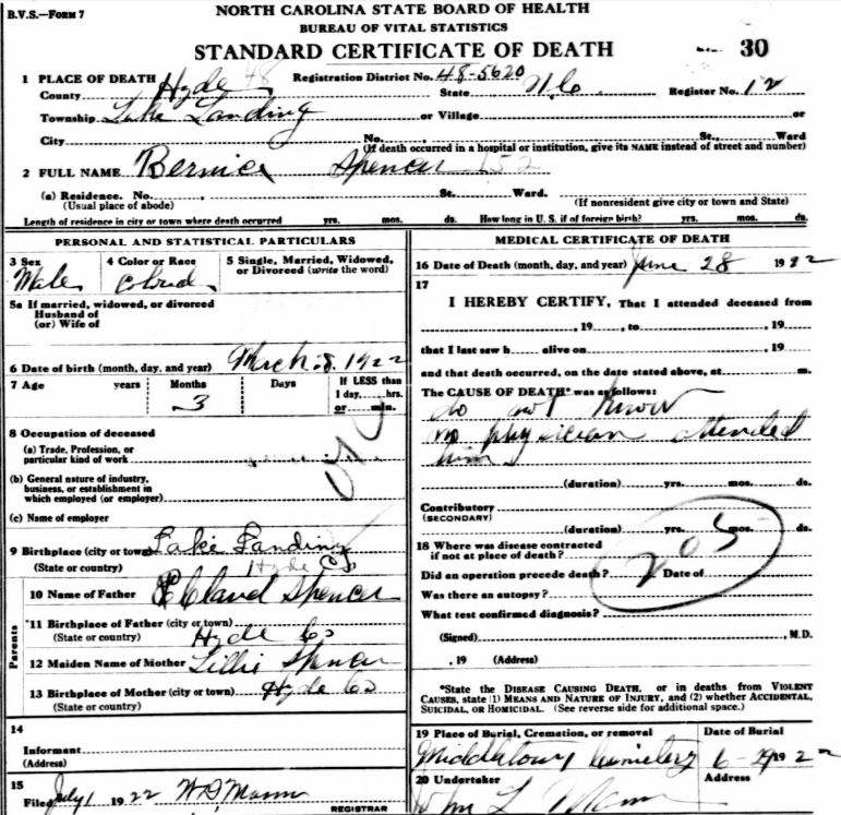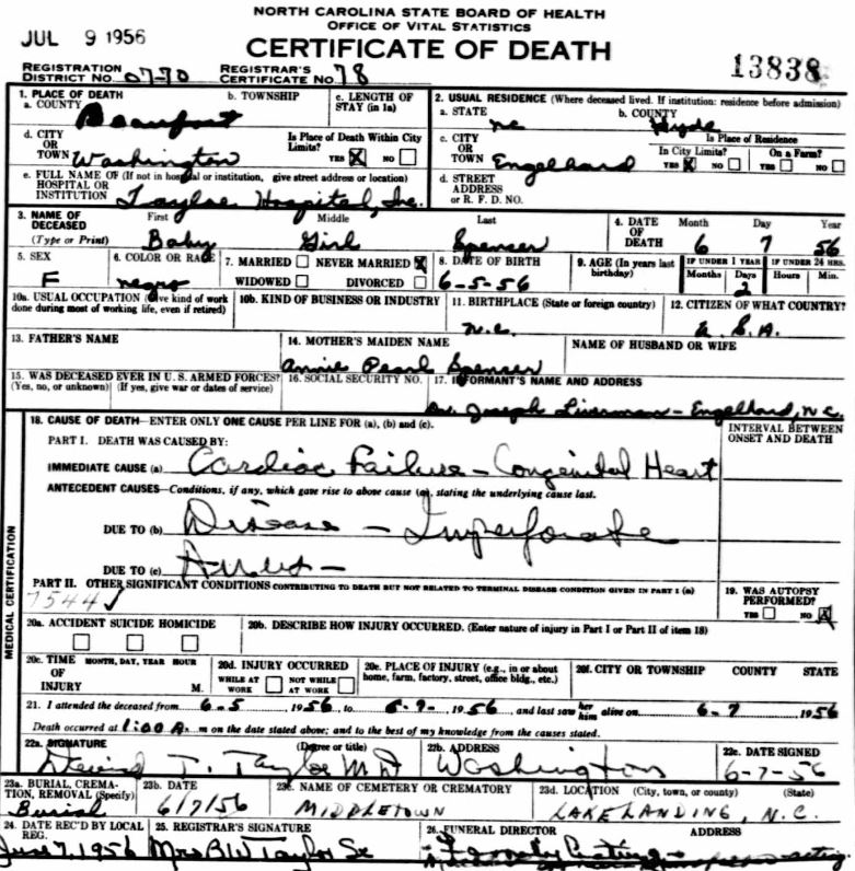 | Spencer, infant girl | June 5, 1956 | June 7, 1956 | [see death certificate] |