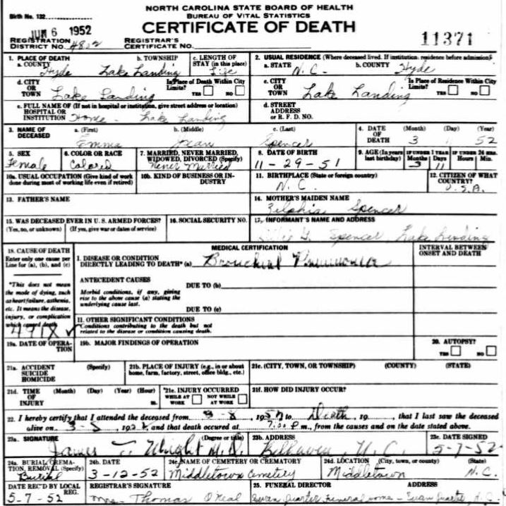 | Spencer, Emma Jean | Nov. 29, 1951 | Mar. 11, 1952 | [see death certificate] |