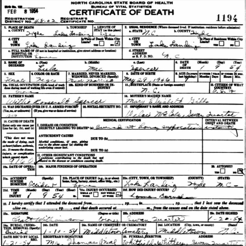 | Spencer, Eula Mae | May 29, 1946 | Jan. 9, 1954 | [see death certificate] |