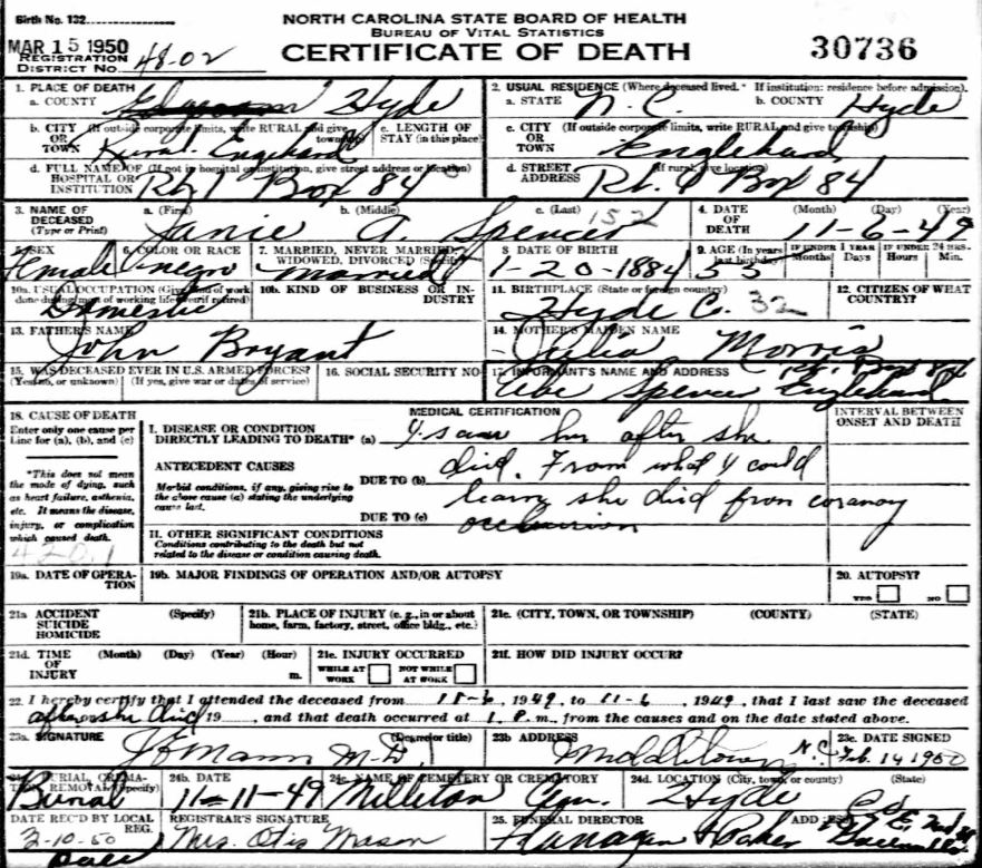 | Spencer, Janie A. | Jan. 20, 1884 | Nov. 6, 1949 | [see death certificate] |