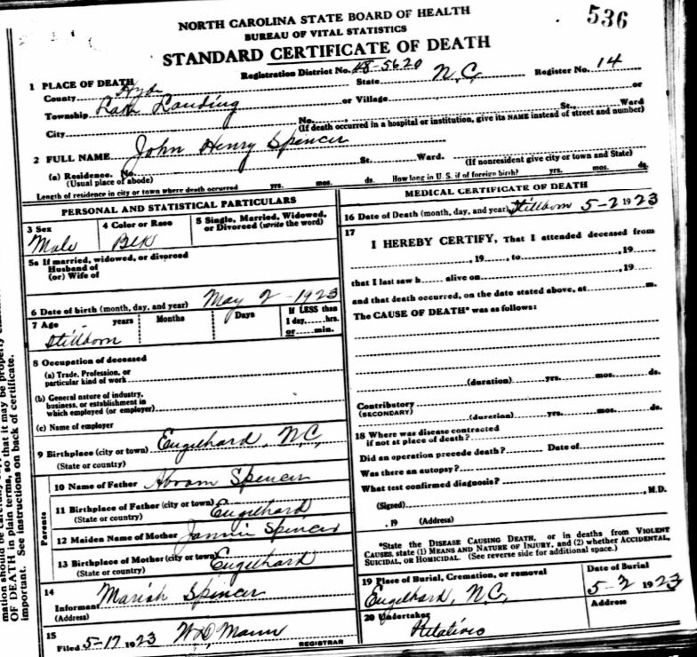 | Spencer, John Henry | May 2, 1923 | May 2, 1923 | [see death certificate] |