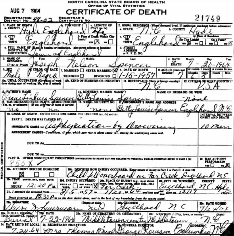| Spencer, Joseph Nelson | Jan. 15, 1957 | July 20, 1964 | [see death certificate] |