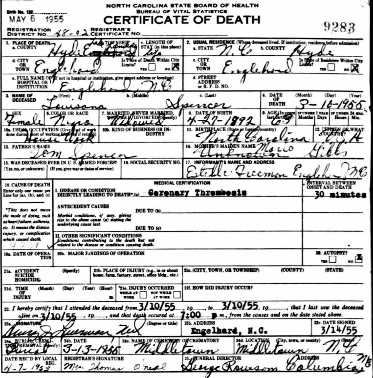 | Spencer, Louisana | Apr. 27, 1892 | Mar. 10, 1955 | [see death certificate] |