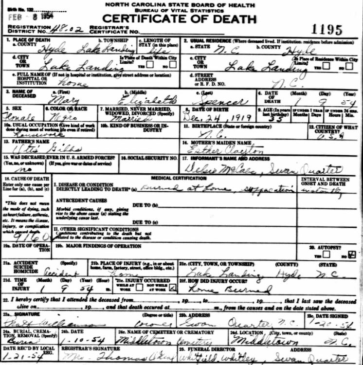 | Spencer, Mary Elizabeth | Dec. 24, 1919 | Jan. 9, 1954 | [see death certificate] |