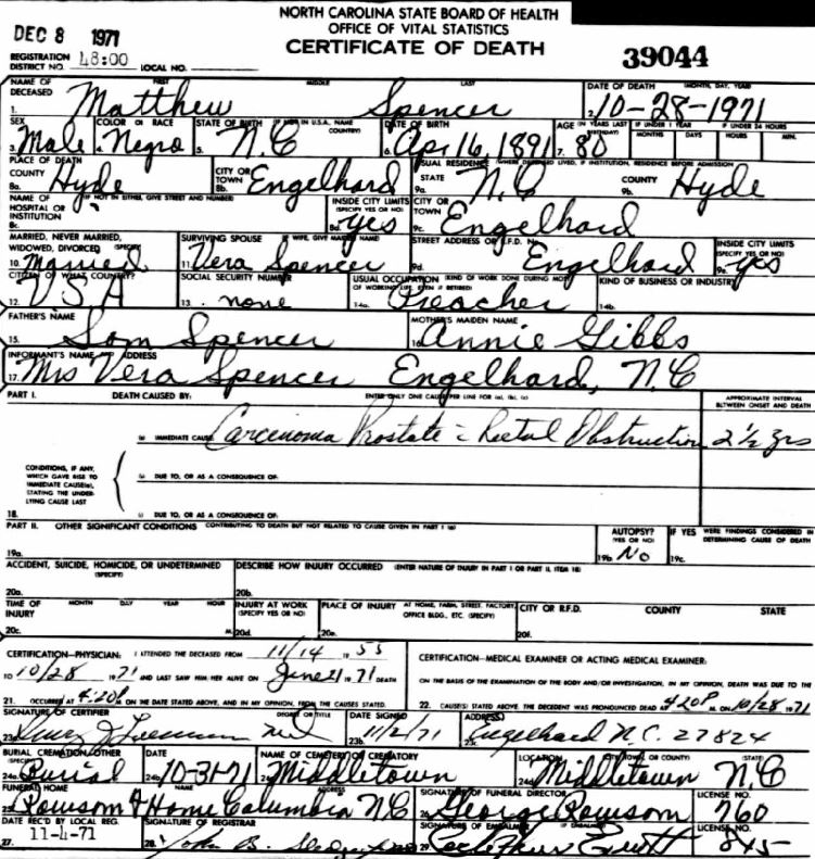 | Spencer, Matthew | April 16, 1891 | Oct. 28, 1971 | [see death certificate] |