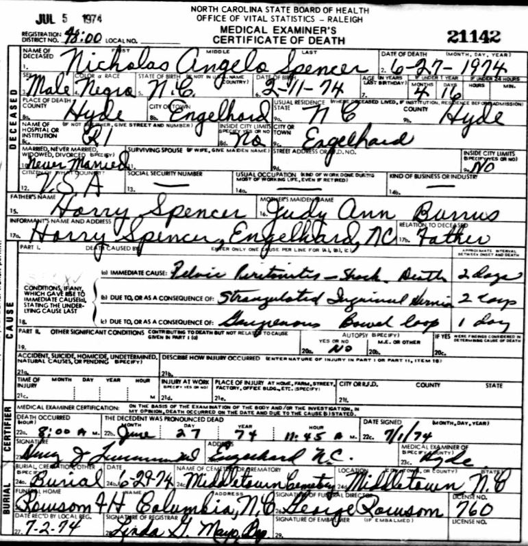 | Spencer, Nicholas Angelo | Feb. 11, 1974 | June 27, 1974 | [see death certificate] |