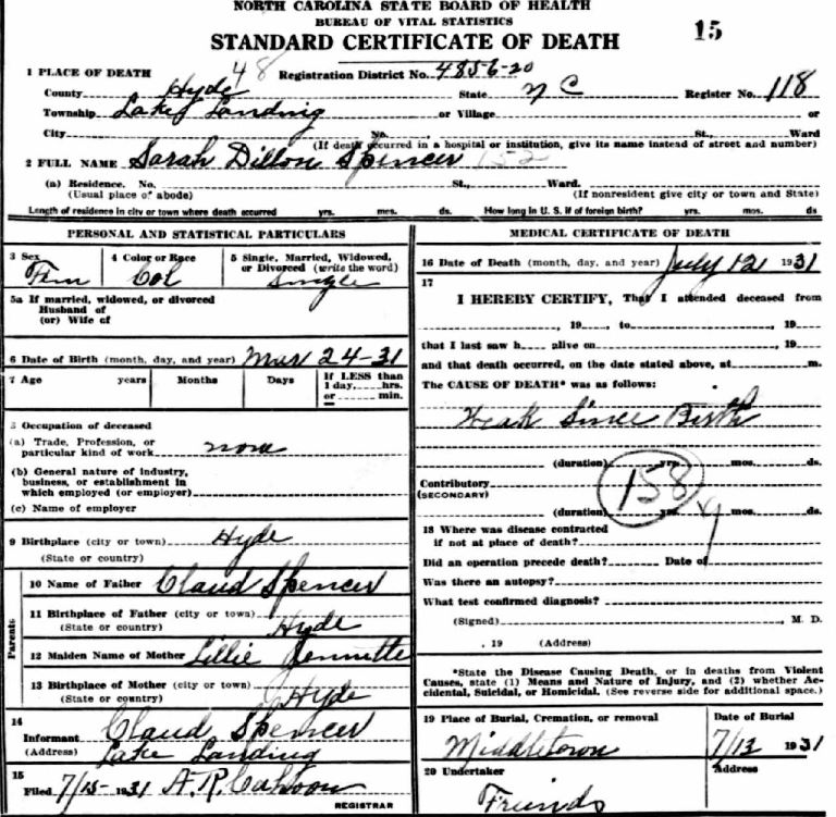 | Spencer, Sarah Dillon | Mar. 24, 1931 | July 12, 1931 | [see death certificate] |
