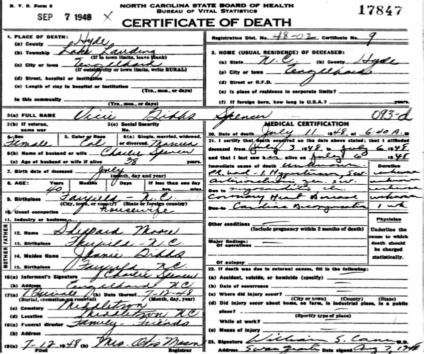 | Spencer, Vicie Gibbs | July __, 1908 | July 11, 1948 | [see death certificate] |