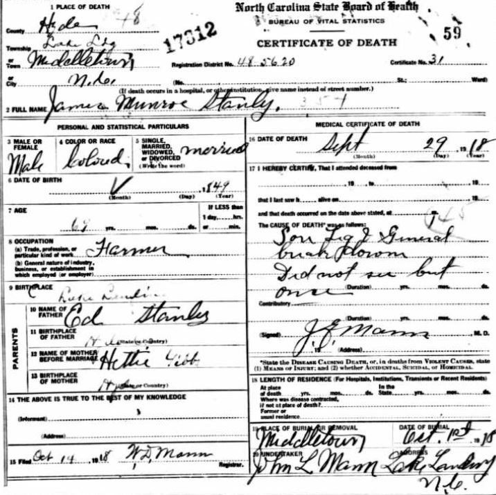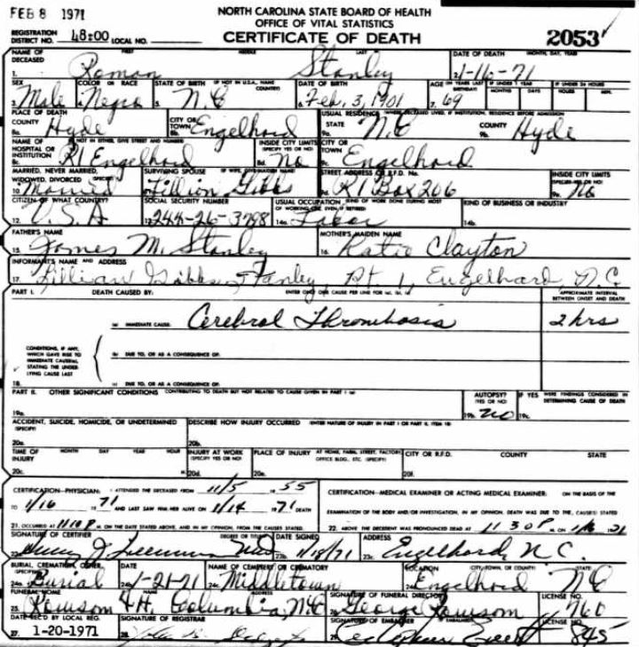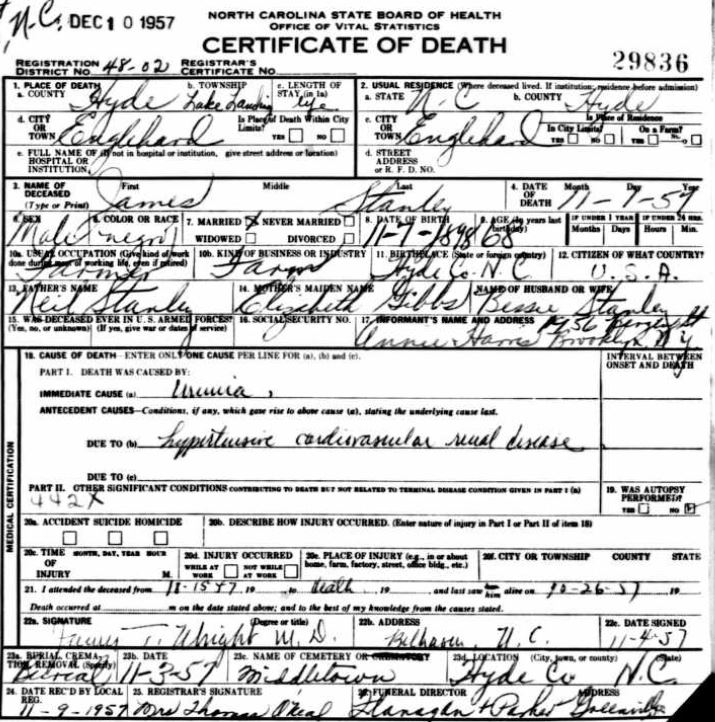 | Stanley, James | Nov. 7, 1898 | Nov. 1, 1957 | [see death certificate] |