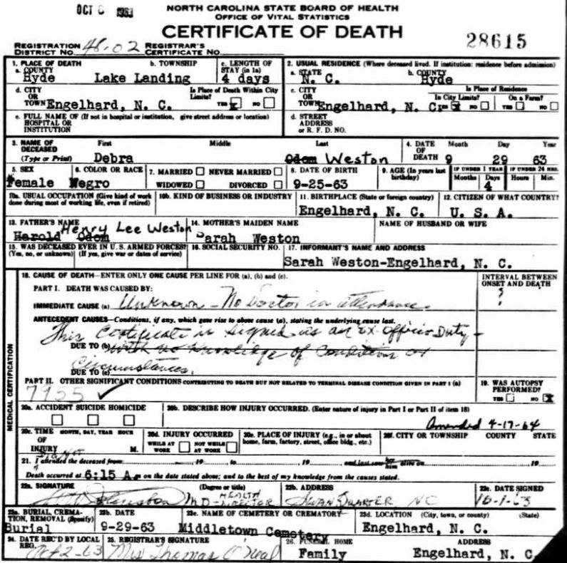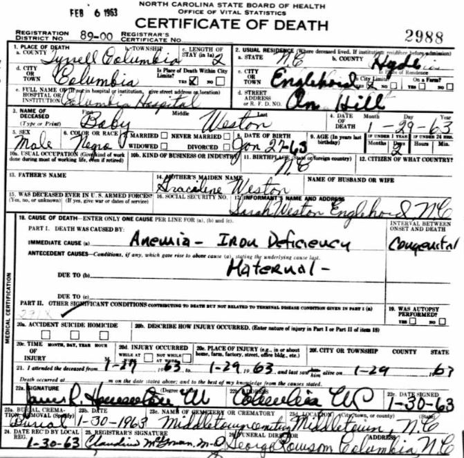 | Weston, infant | Jan. 27, 1963 | Jan. 29, 1963 | [see death certificate] |