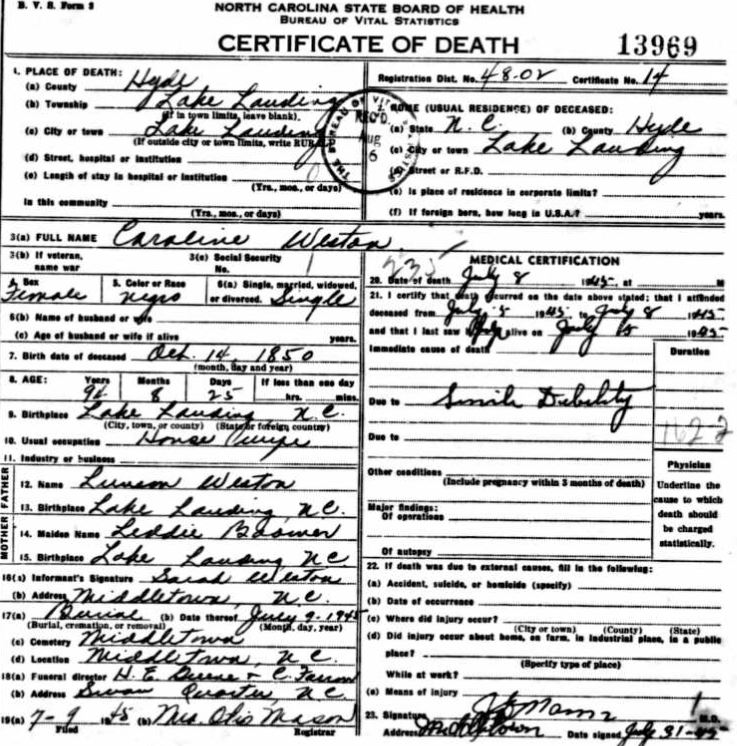 | Weston, Caroline | Oct. 14, 1850 | July 8, 1945 | [see death certificate] |