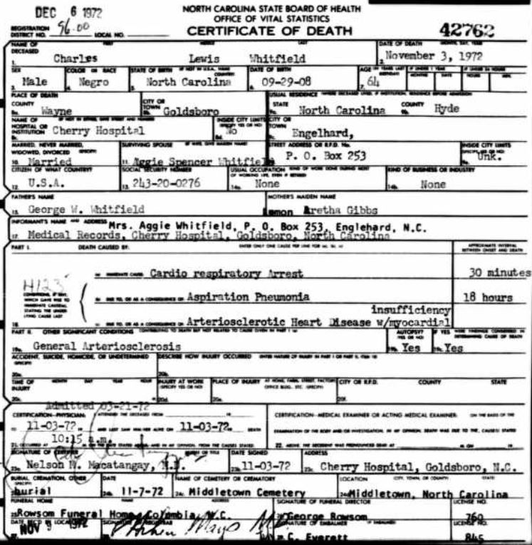 | Whitfield, Charles Lewis | Sept. 29, 1908 | Nov. 3, 1972 | [see death certificate] |