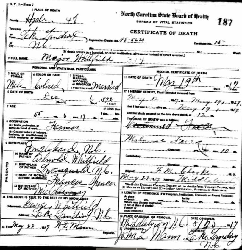 | Whitfield, Major | Dec. 6, 1872 | May 19, 1917 | [see death certificate] |