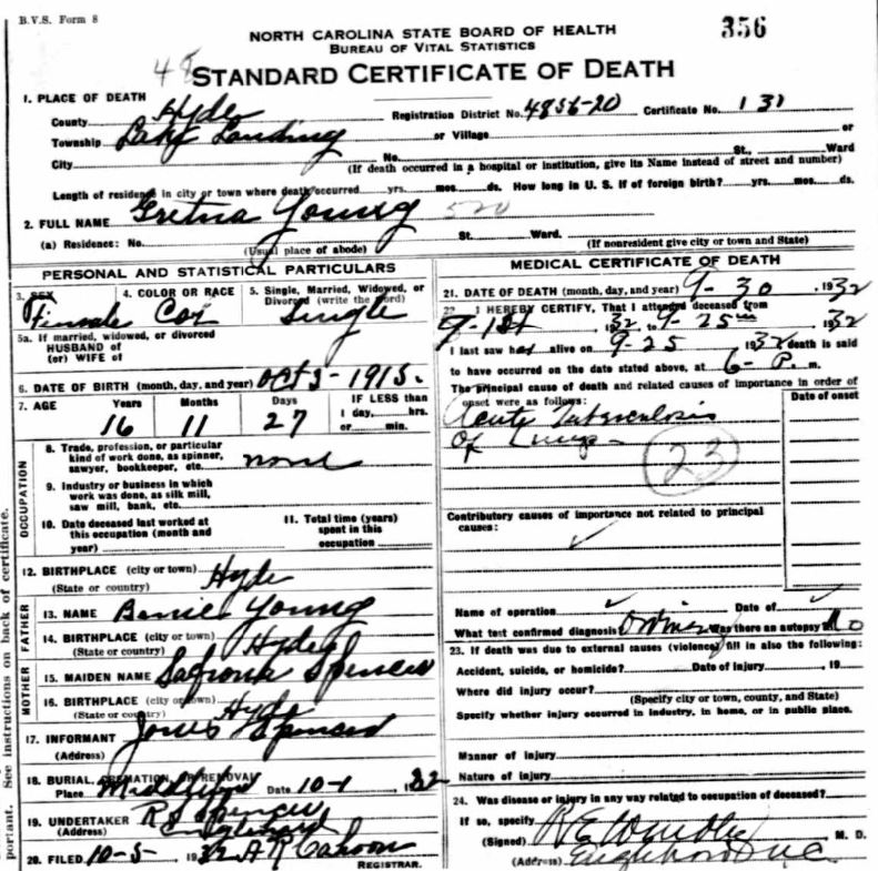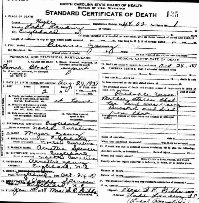 | Young, Bernice | Aug. 24, 1937 | Oct. 24, 1937 | [see death certificate] |