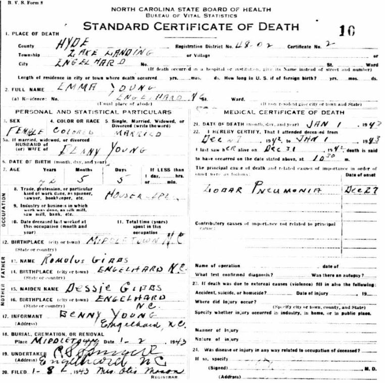 | Young, Emma | July 26, 1899 | Jan. 1, 1943 | [see death certificate] |