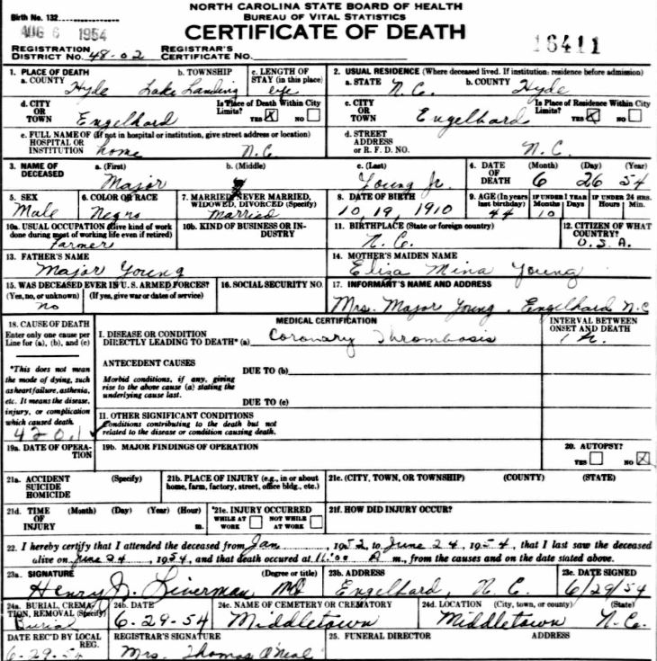 | Young, Jr., Major | Oct. 19, 1910 | June 26, 1954 | [see death certificate] |