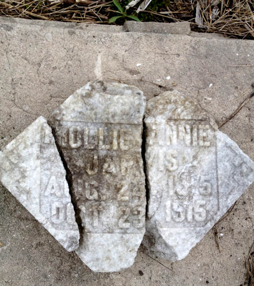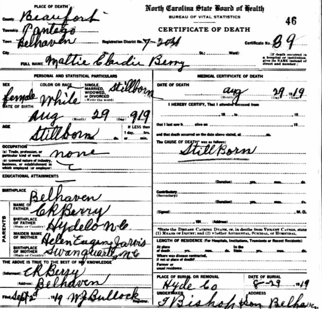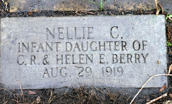 | Berry, Nellie C. | Aug. 29, 1919 | Aug. 29, 1919 | Infant daughter of C.R. & Helen E. Berry | Buried beside her mother, Helen E. Berry [Closeup] [see death certificate that someone has penciled over the name of "Mattie Clardia Berry"] |