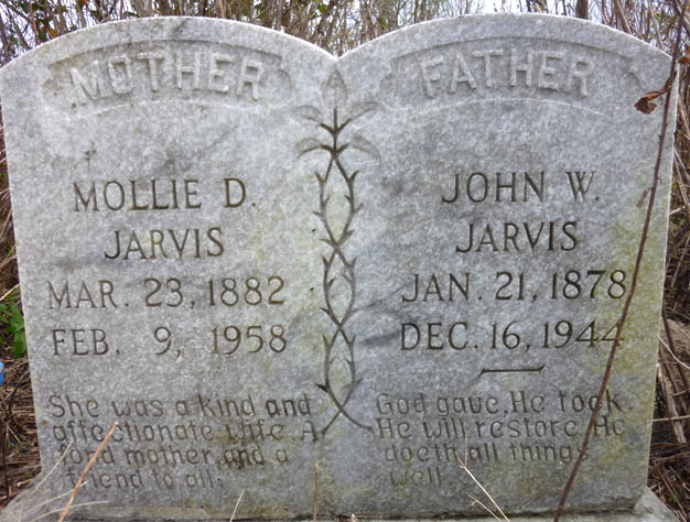 | Jarvis, John W. | Jan. 21, 1878 | Dec. 16, 1944 | Father - God gave. He took. He will restore. He doeth all things well. | Double with Mollie