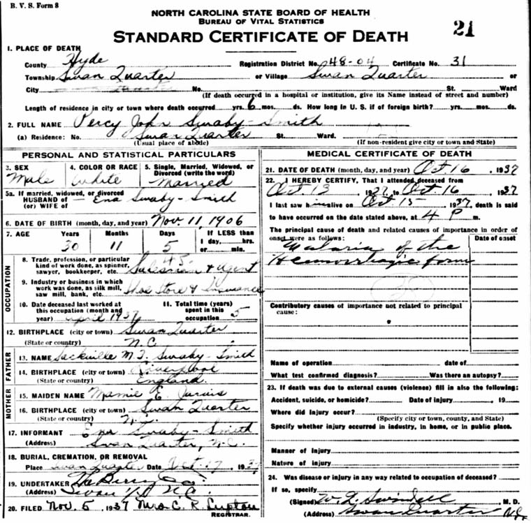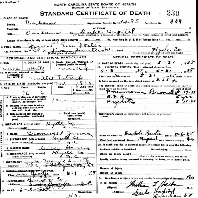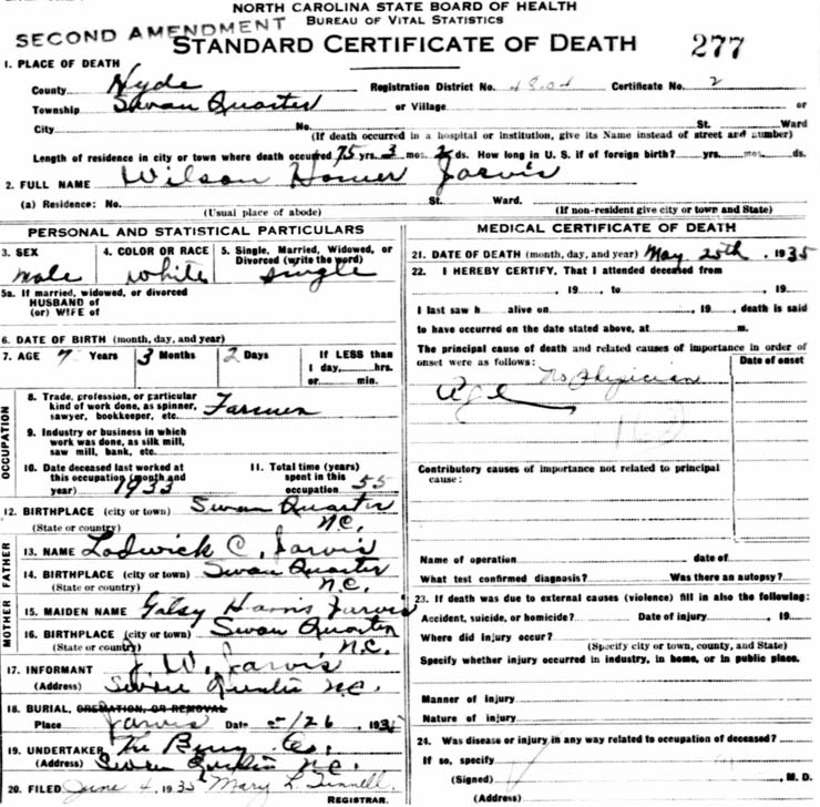 | Jarvis, W.H. [Wilson Homer] | Feb. 23, 1860 | May 25, 1935 | At rest. | On May 25 Mr. Homer JARVIS of Swan Quarter passed away. He had lived the bachelor life. He had accumulated a considerable amount of wealth. Four brothers survive him: Capt. Foster JARVIS, John JARVIS, Walter JARVIS of Washington and Edmond JARVIS. Services were conducted by Rev. Roe L. HARRIS of Fairfield. (Hyde County Messenger - June 1935) [see death certificate] |