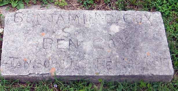 | Cox, Benjamin C. | Jan. 30, 1892 | Feb. 24, 1897 | Son of Ben Cox | [Apprears to be a homemade stone] Young son of Benjamin Fenner Cox |