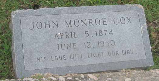 | Cox, John Monroe | April 5, 1874 | June 12, 1950 | His love will light our way | [In Memory Of has his names as James Monroe Cox] |