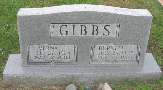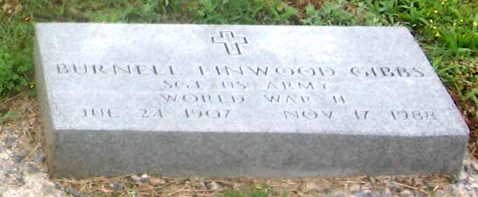 | Gibbs, Burnell Linwood | July 24, 1907 | Nov. 17, 1988 | Sgt. US Army - World War II | [double with Verna J. Gibbs] [military stone] |