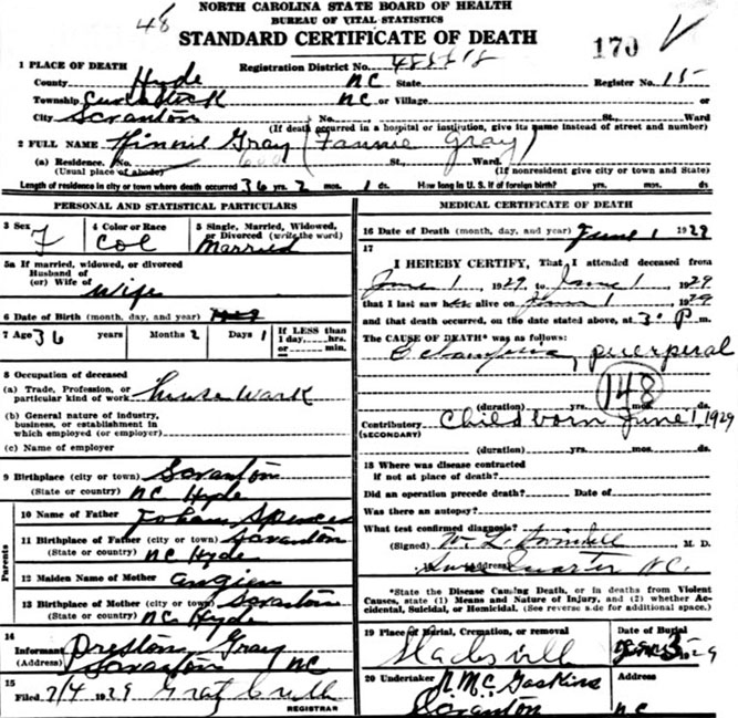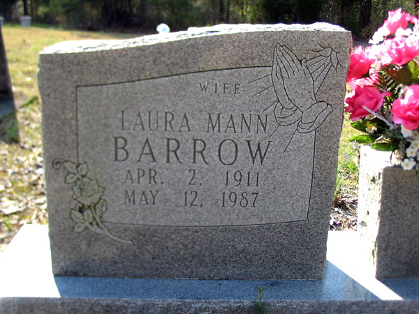 | Barrow, Jessie | Mar. 28, 1904 | Nov. 6, 1984 | Husband | Double with Laura Mann Barrow [Hyde Co. Death Certificate Index] [Longshot] Laura Mann married Jessie Barrow Apr. 14, 1935 |