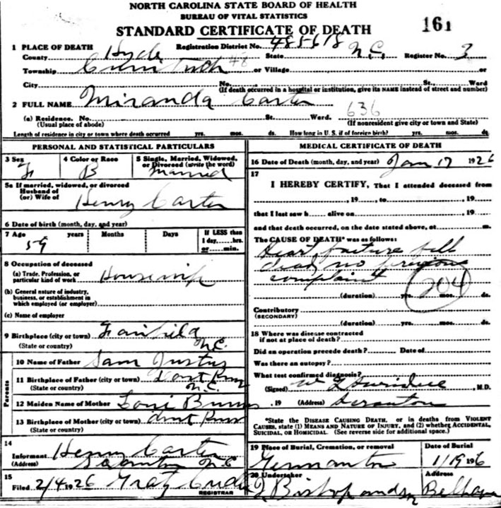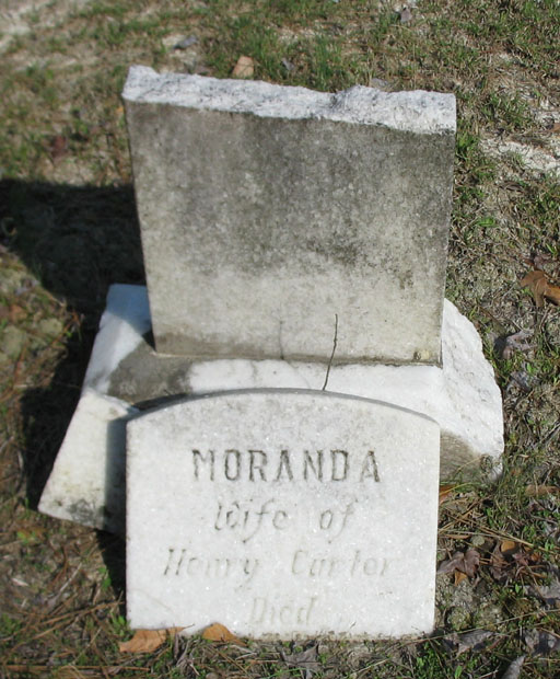 | Carter, Moranda [Miranda] | [c1867] | [Jan. 17, 1926] | Wife of Henry Carter | Broken stone [Death Certificate] |