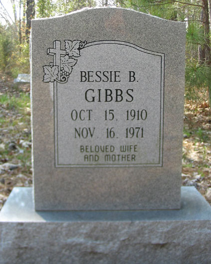 | Gibbs, Bessie B. | Oct. 15, 1910 | Nov. 16, 1971 | Beloved Wife and Mother | [Death Certificate states birth as Oct. 10, 1910] [Longshot] |