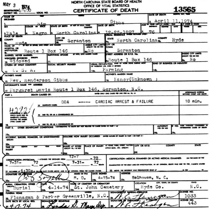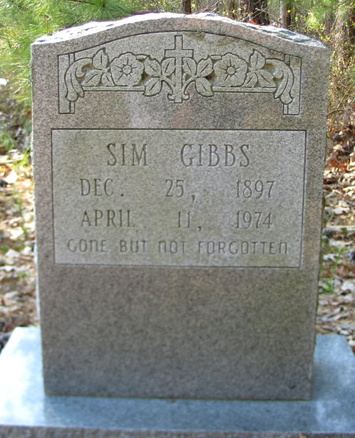 | Gibbs, Sim | Dec. 25, 1897 | April 11, 1974 | Gone But Not Forgotten | [Death Certificate] |