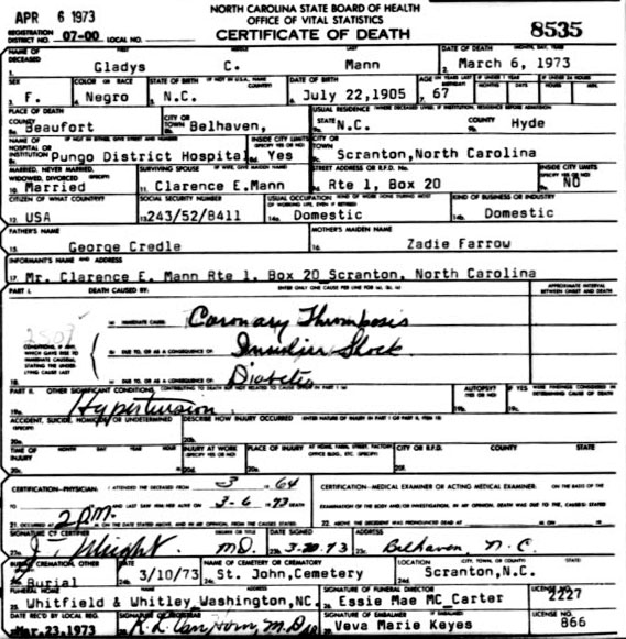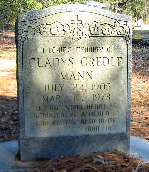 | Mann, Gladys Credle | July 22, 1905 | Mar. 6, 1973 | In Loving Memory Of - Let not your heart be troubled; Ye believed in God, believe also in me - John 14:1" | |