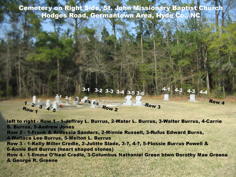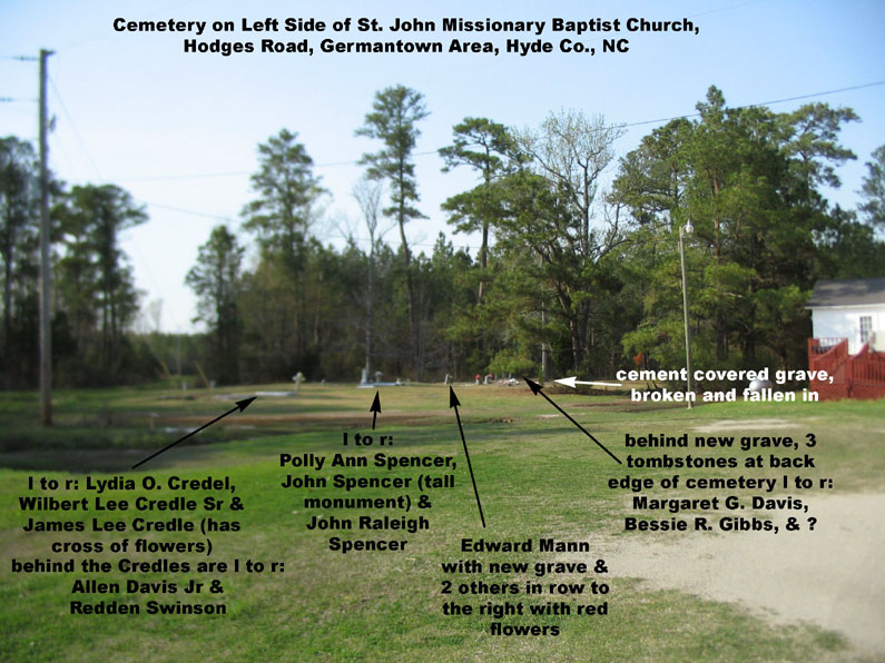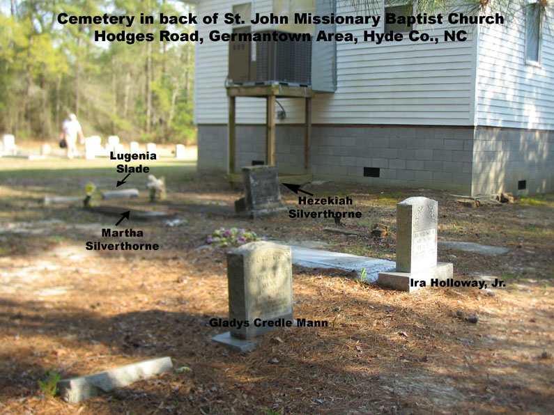 The names listed below that have no photos linked to them comes entirely from a booklet entitled Report of Black Cemeteries in Currituck, Swan Quarter, Engelhard and Lake Landing. It was compiled by Marjorie T. Selby in 1975. Mrs. Selby was a teacher at Mattamuskeet High School and portions of this booklet were researched by her history class. These listings are said to be persons reportedly buried in St. John's Cemetery without grave markers.