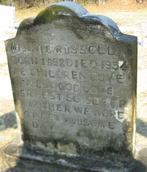 | Russell, Minnie | [Feb. 14] 1892 | [June 13]1953] | We children love her but God love her best so sleep mother we hope to meet you some day | [Death Certificate] |