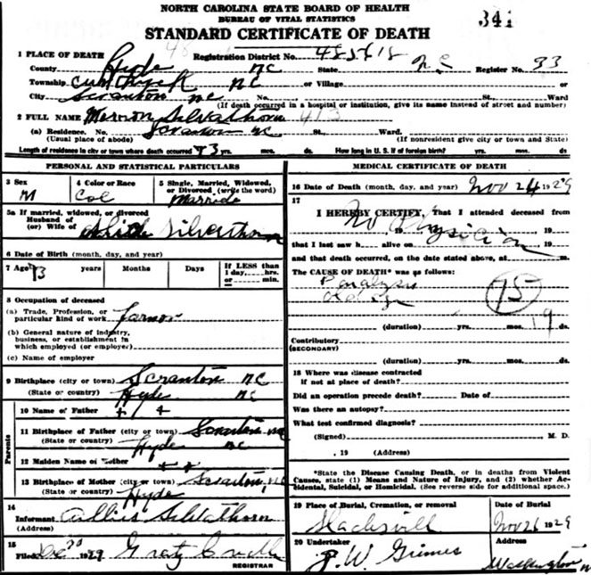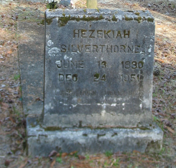 | Silverthorne, Hezekiah | June 13, 1880 | Dec. 24, 1951 | Lifes work well done, he rests in peace. | [Hyde Co Delayed Birth Certificate for Leander Silverthorne states parents as Hezekiah & Martha L. Silverthorne] |