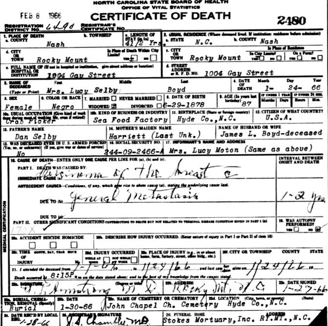| Boyd, Lucy (Selby) | June 29, 1878 | Jan. 25, 1966 | [Death Certificate states death as Jan. 24, 1966 in Rocky Mount, NC] Lucy Selby married James Boyd Dec. 21, 1893 | |