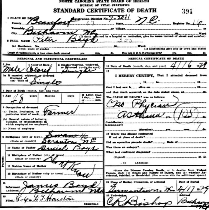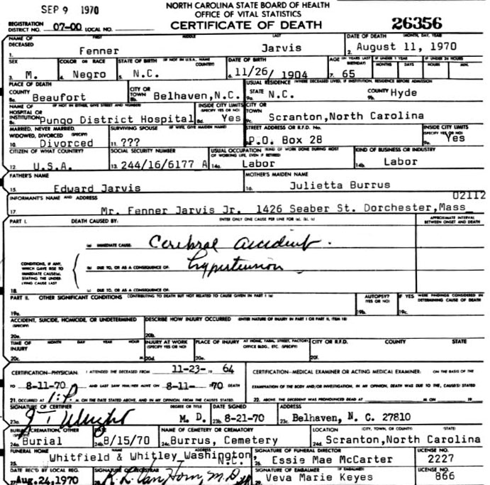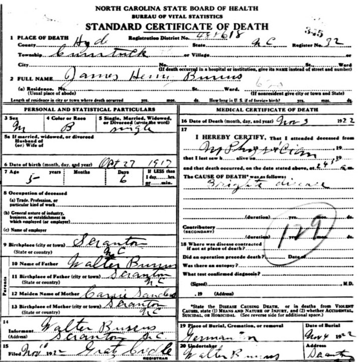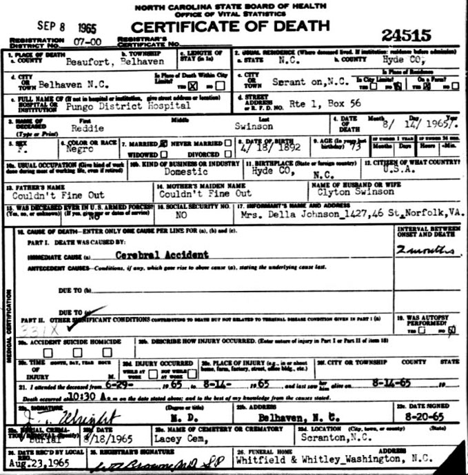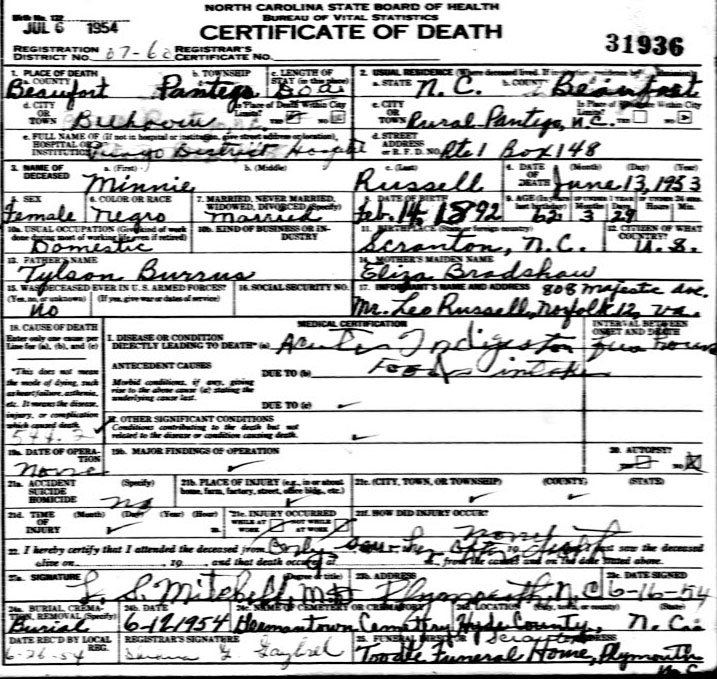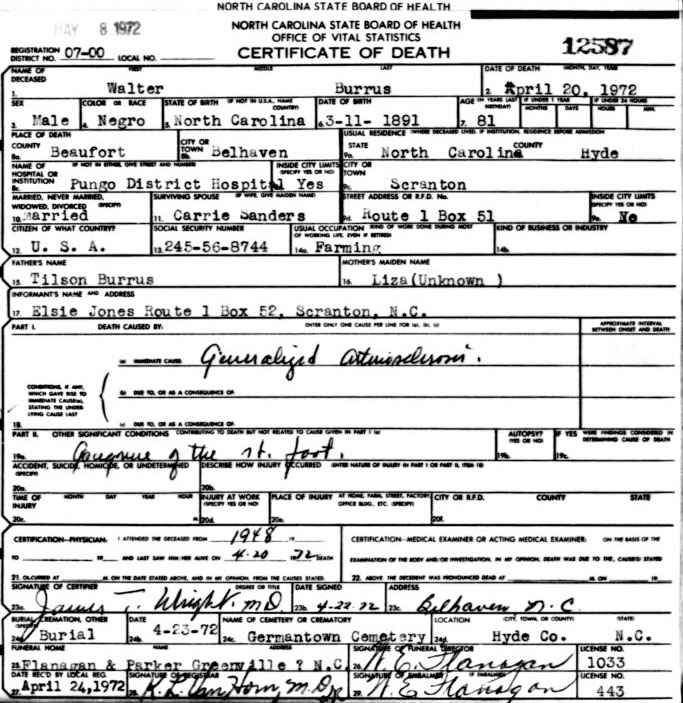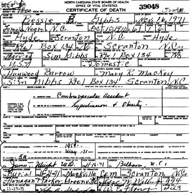 | Burrus, Annie Bell | Sept. 12, 1912 | Sept. 14, 2004 | Now…In God's care | [Hyde Co. Delayed Birth Certificate states born Sept 3, 1912] |