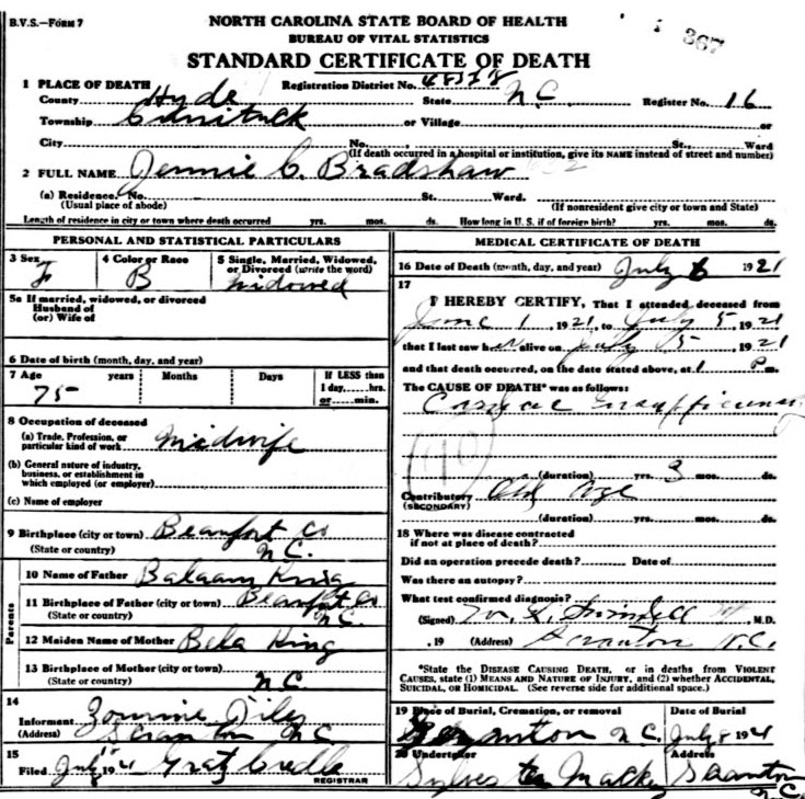 | Bradshaw, Jennie C. | c1846 | July 6, 1921 | Daughter of Balaam King & Bela ______ [Death Certificate] | |